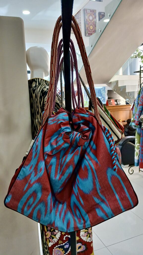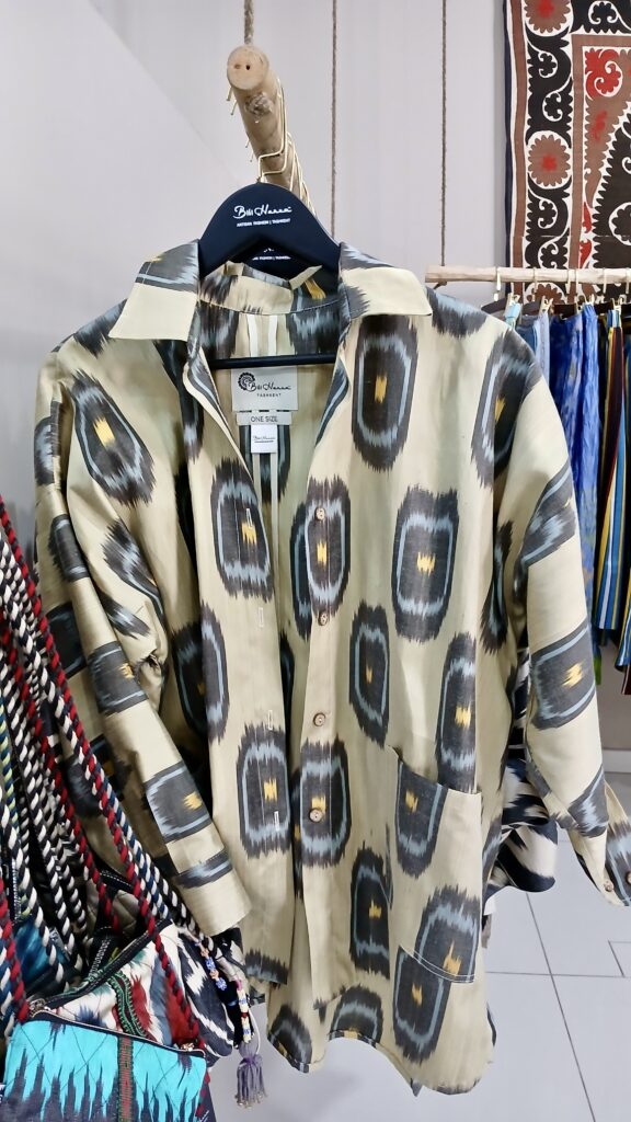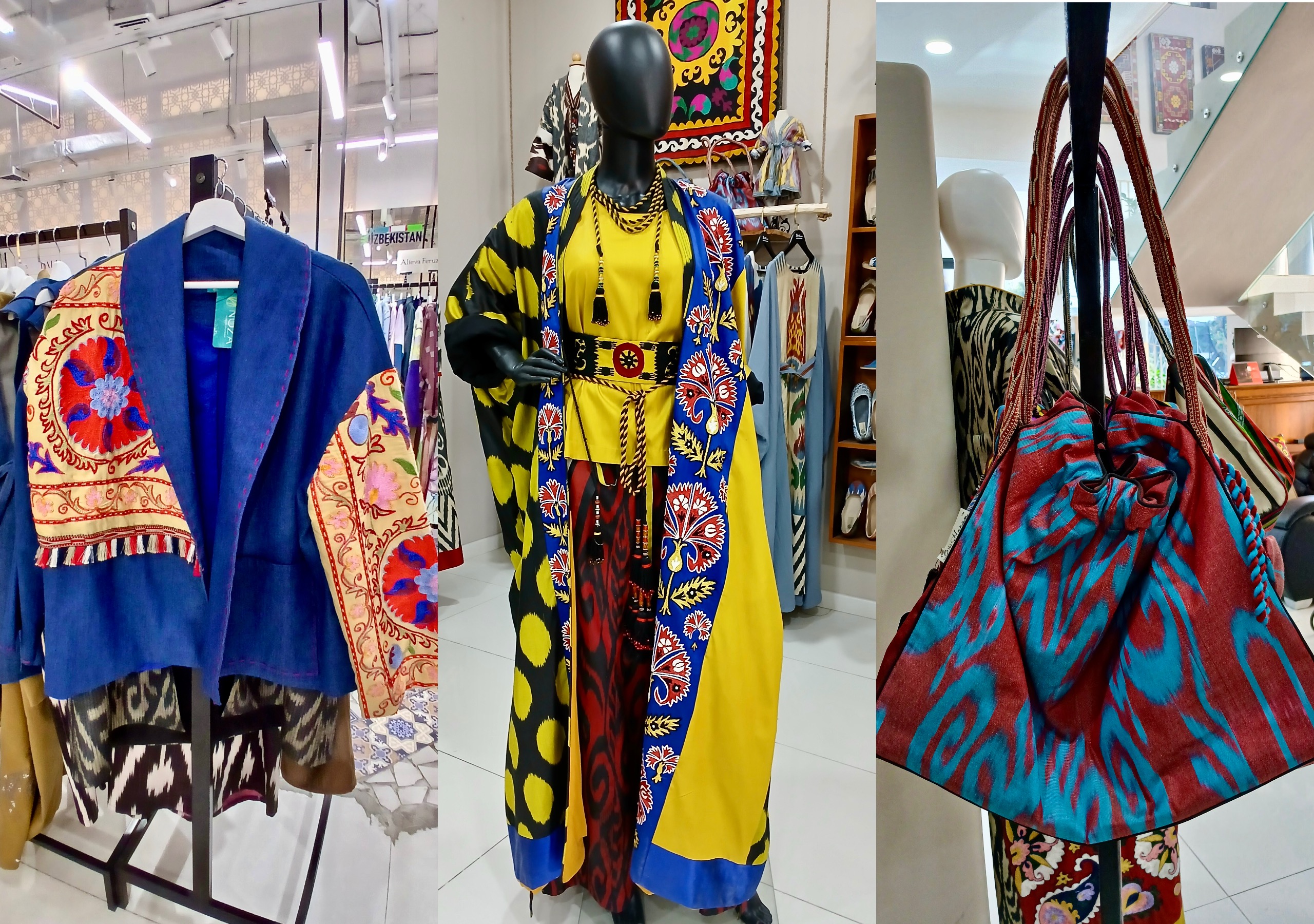 А вот в этом дизайнерском магазине нам понравилось. Он расположен буквально напротив базара Чорсу. Здесь прекрасно все. И сам бутик, светлый, просторный. И вещи. Все ручная работа – в том числе окрашивание тканей. И при этом дизайнерская. Эксклюзивный дизайн, самые яркие краски и уникальные комбинации традиционных узоров – все это дизайнер и владелица Bibi Hanum Мухайё Алиева. Блузки и халаты здесь тоже с национальными узорами и вышивками и при этом выглядят как будто только что с подиума недели моды.