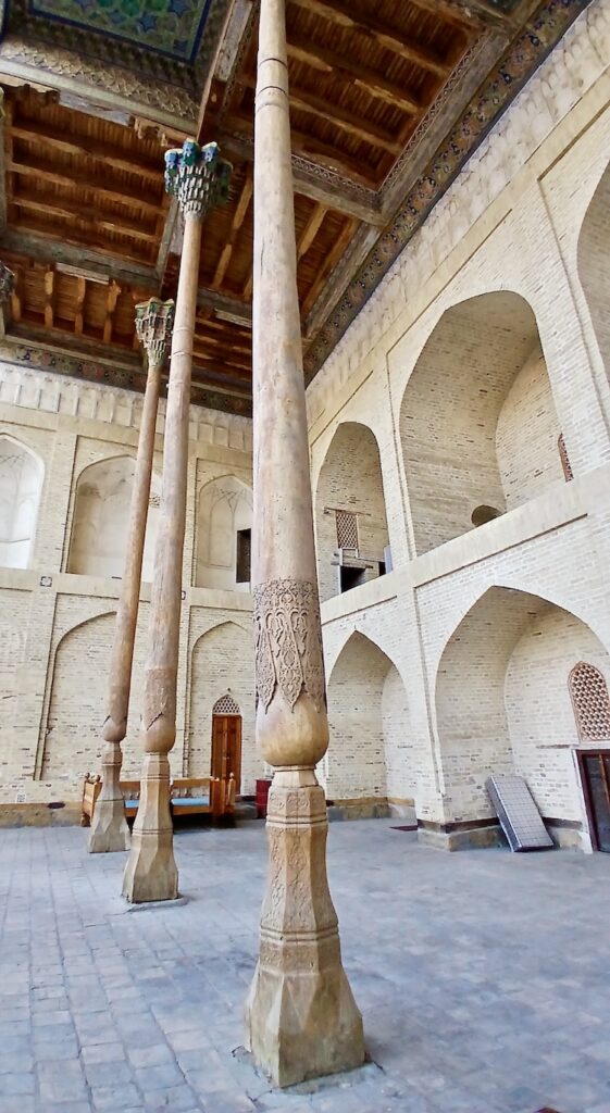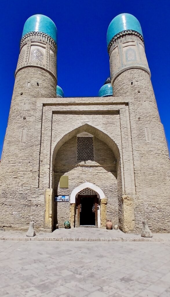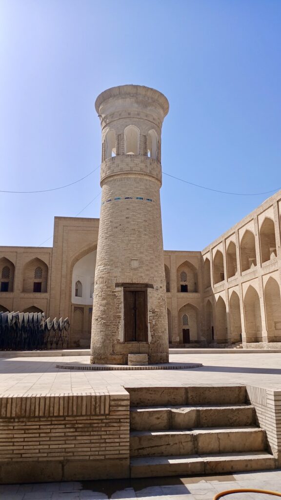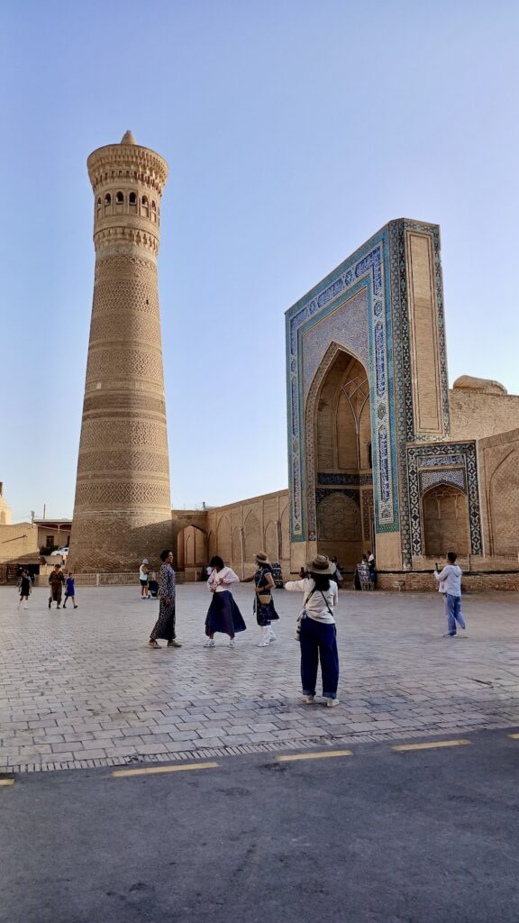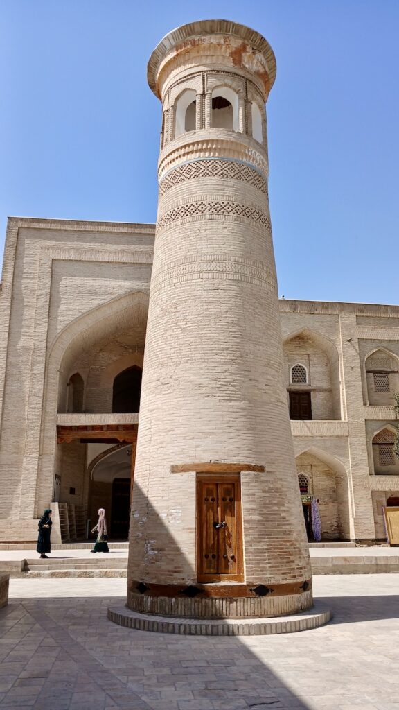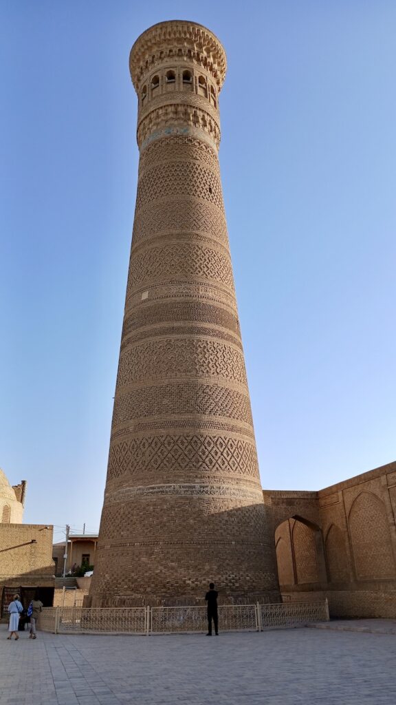 С ним связана красивая легенда о том, что Чингизхан, завоевав Бухару, подошел к этому минарету, который был символом города, и посмотрел наверх. Его тюбитейка упала с головы, он наклонился поднять – и так поклонился минарету. Ну и в общем передимал его разрушать 🙂