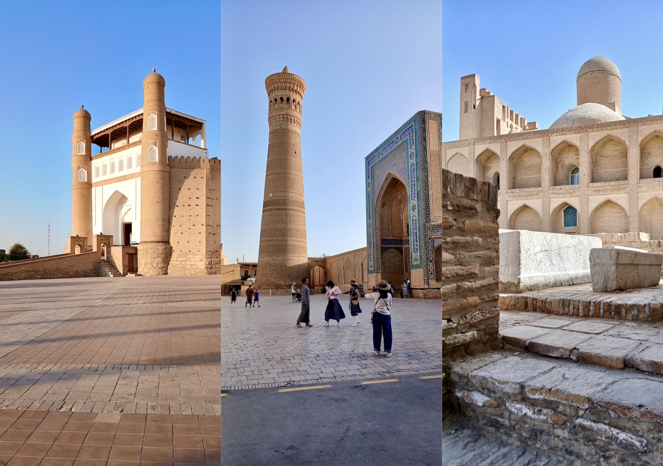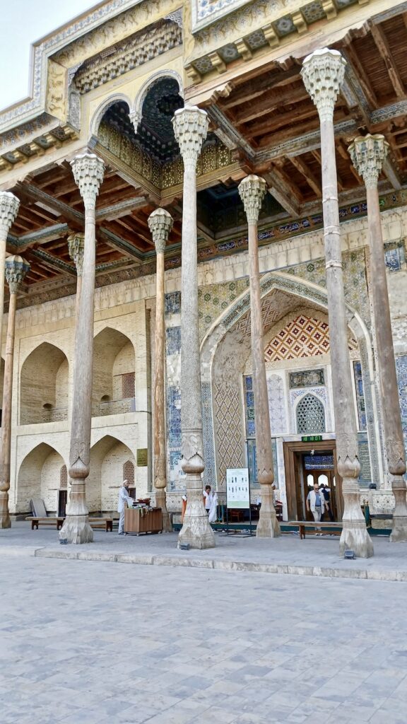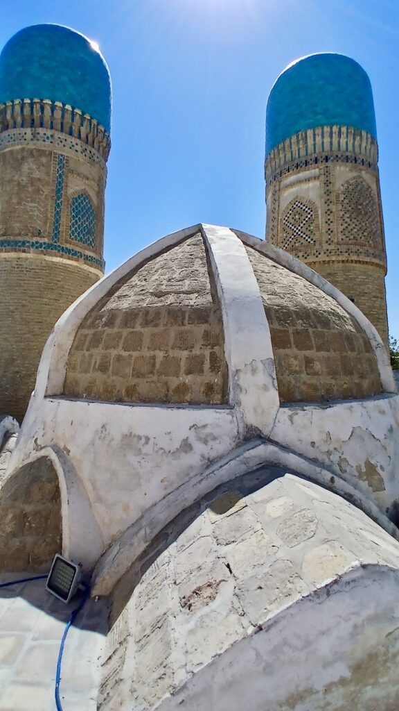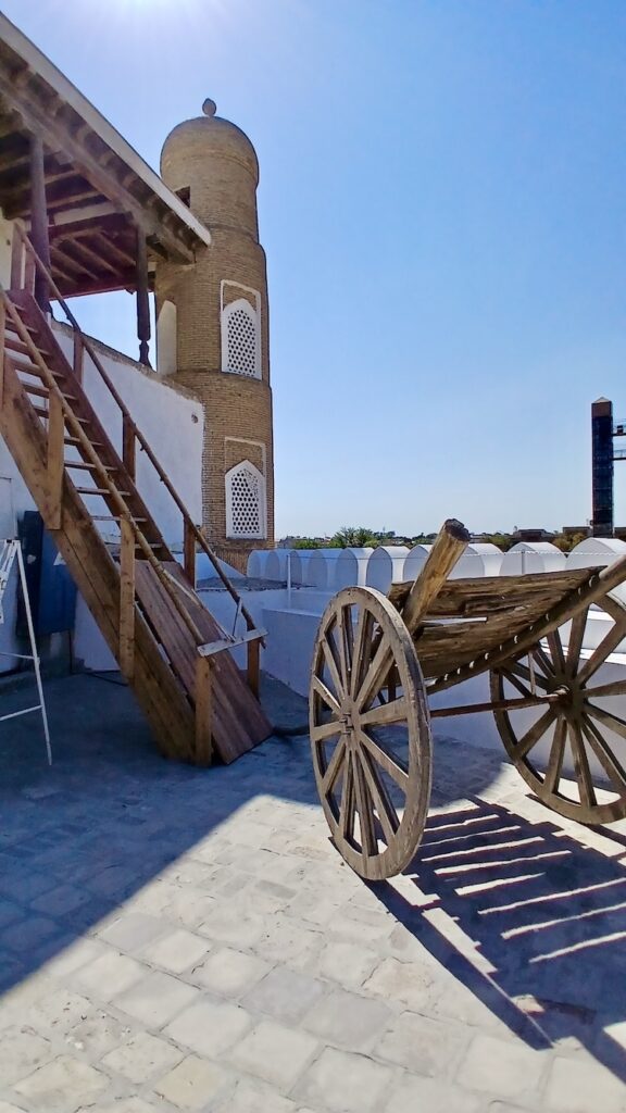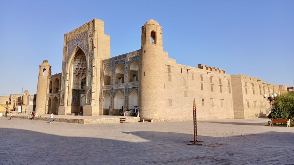 С ним связана красивая легенда о том, что Чингизхан, завоевав Бухару, подошел к этому минарету, который был символом города, и посмотрел наверх. Его тюбитейка упала с головы, он наклонился поднять – и так поклонился минарету. Ну и в общем передимал его разрушать 🙂