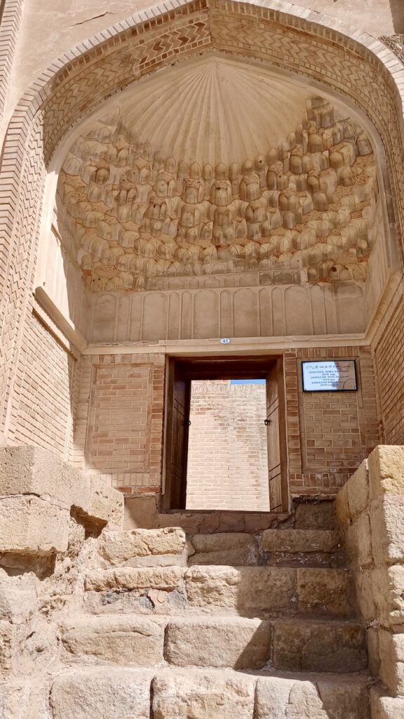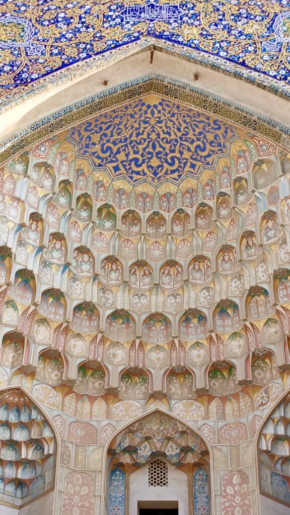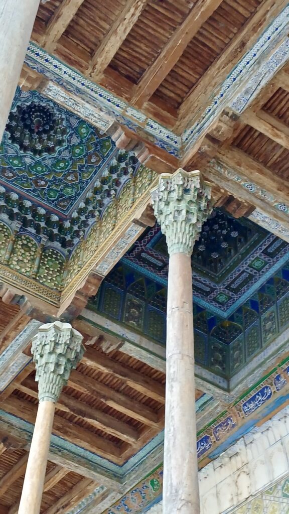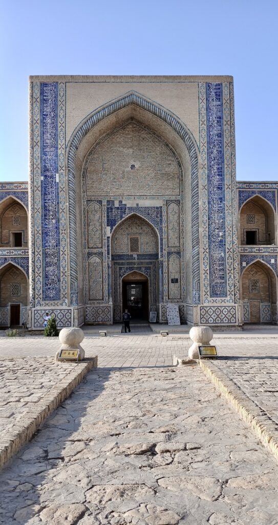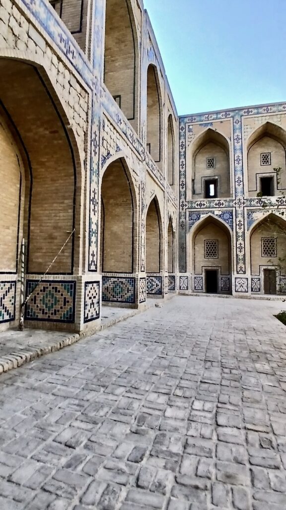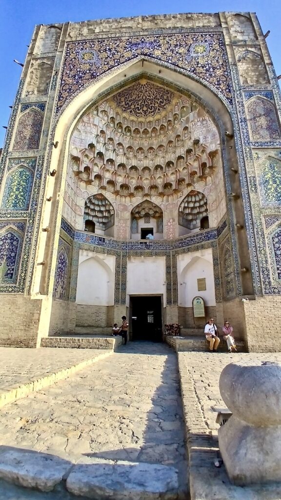 Ее вы точно не забудете никогда 🙂 В целом все медресе очень похожи. Эта устроена совершенно индивидуально 🙂 Сохранилась двухэтажная входная секция с башнями. На первом этаже был вестибюль, на втором библиотека. Башни никогда не были минаретами, это просто декоративные элементы.