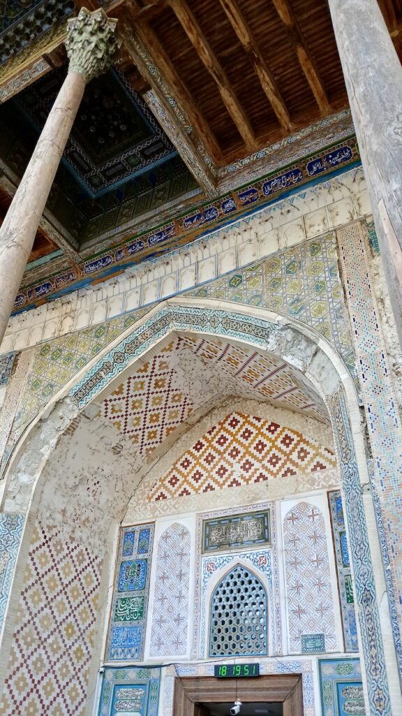 Напротив медресе Улукбека с красивым необычным порталом из золотисто-розоватой плитки. И с момента постройки в 17-м веке ее почти не ремонтировали.