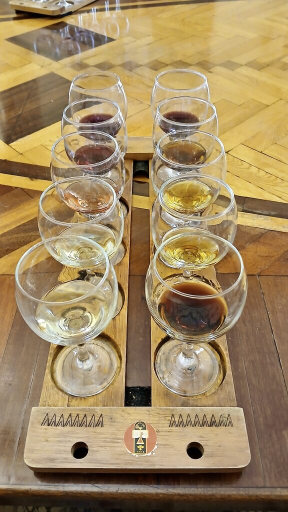 Выяснилось, что сначала предлагают самостоятельно осмотреть экспозицию, и каждый ровный час начинается дегустация: 10 напитков по 25 миллилитров – 7 вин, 2 коньяка и один черный бальзам, все производится в Узбекистане. Кстати, в стране растет около 100 сортов винограда, часть местные, часть завезенные.